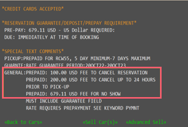 Les tarifs prépayés doivent être spécifiquement demandés. À l’aide d’une entrée de terminal, ajoutez /Y à votre demande de recherche de voiture (par exemple, CAL13JAN-15JANDEN/ARR-1400/DT-1400/Y). Dans le panneau de recherche de disponibilité de voiture, choisissez Tarif prépayé dans la catégorie de tarif.