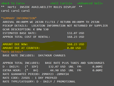 Confirmation de la date, de l’heure et du lieu de prise en charge et de retour de la voiture de location. Comprend la description du type de voiture et le total approximatif. Ajouté en juillet 2023. Les renseignements sur le montant dû pour les tarifs prépayés ont été ajoutés aux renseignements sommaires. ![]() Si des tarifs prépayés sont présents, les règles de voiture affichent les informations sur les tarifs prépayés sur deux nouvelles lignes de la section Informations récapitulatives : Montant dû maintenant et Montant dû au guichet.