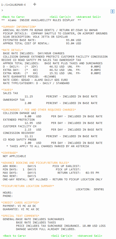 Frais journaliers/horaires, récapitulatif du tarif unitaire, ventilation du montant total approximatif, frais de dépôt, période de garantie du tarif, code tarifaire, type et catégorie de tarif. Ajouté en décembre 2022. Le cas échéant, les informations sur les remises d’entreprise sont affichées. Note: Les tarifs du week-end apparaissent comme un tarif journalier. Par exemple, « Wkend Daily ». |