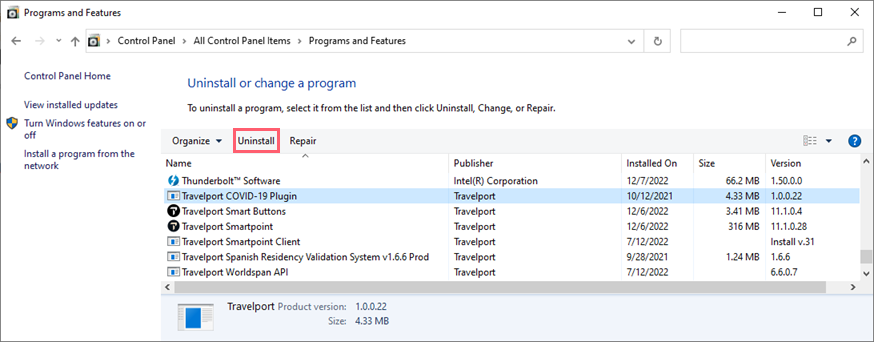 Pour désinstaller le plug-in Travelport COVID-19 Smartpoint :