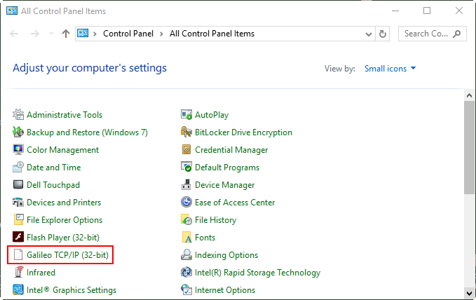 Dans le Panneau de configuration, double-cliquez sur Galileo TCPI/IP.