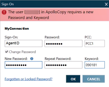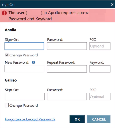 La première fois que vous vous connectez à Travelport+ (1G) ou Apollo (1V) avec un nouvel identifiant client (empreinte SSL Thumbprint), vous devez modifier votre mot de passe et fournir une adresse e-mail unique.