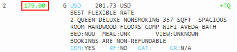 Le cas échéant, la catégorie est répertoriée. ![]() R- Standard/Rack C - Entreprise W - Week-end P - Forfait S - Aîné G - Gouvernement M - Militaire B - Club A - L’association F - Régime familial T - Tour I - Industrie du voyage V - Convention l - Spécial N - Négocié |