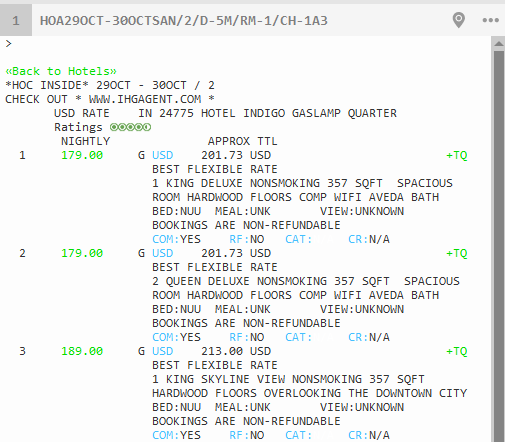 Le tarif total et le code de devise pour la période de disponibilité demandée. L’en-tête TTL APPROX de cette colonne indique que le taux de chaque poste est le total approximatif de la période et n’est pas définitif. |