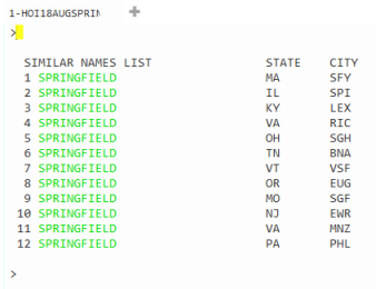 - S’il y a plus d’une occurrence d’une ville ou d’un point de référence, sélectionnez l’emplacement souhaité dans la liste des noms similaires. Par exemple, si Springfield est demandé, une liste de noms similaire s’affiche.