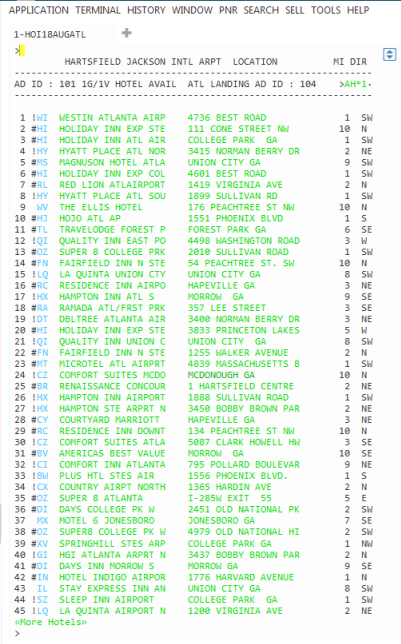 Dans l’exemple suivant, un index d’hôtel s’affiche pour les établissements proches de l’aéroport international Hartsfield Jackson d’Atlanta pour le 18 août : HOI18AUGATL.