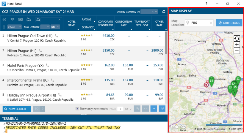 Dans Hotel Retail, une carte s’affiche avec la liste des hôtels et les détails des tarifs.