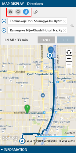 Par exemple, vous pouvez sélectionner l’icône Marche pour afficher l’itinéraire piétonnier et le temps de trajet estimé.