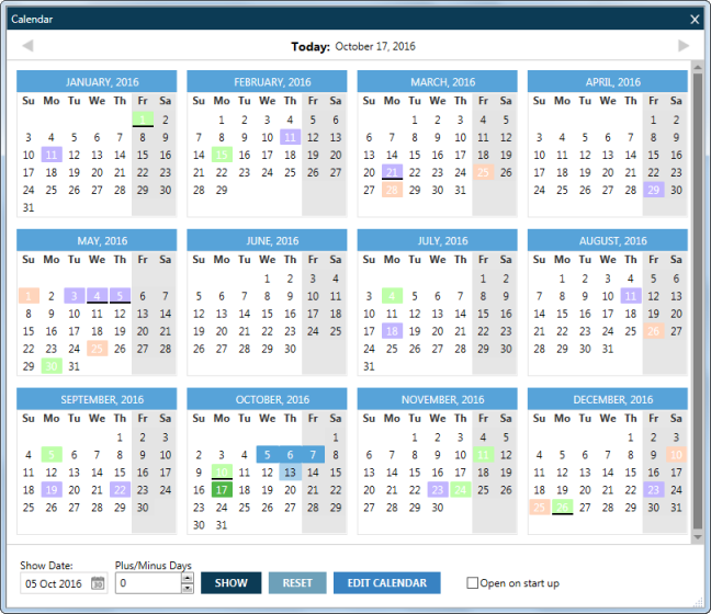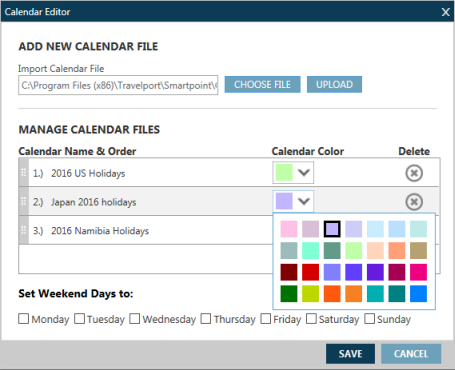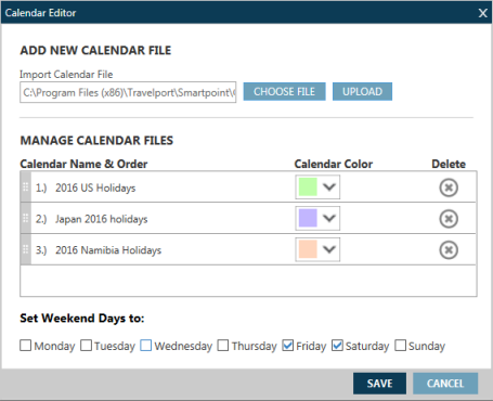 Vous pouvez modifier les paramètres du calendrier pour afficher des dates spéciales, telles que des jours fériés, des week-ends alternatifs et des événements. Vous pouvez charger plus qu’un fichier de calendrier personnalisé, ce qui vous permet d’afficher des dates spéciales pour les paramètres régionaux de vos agences en plus des dates spéciales pour les destinations de vos voyageurs.