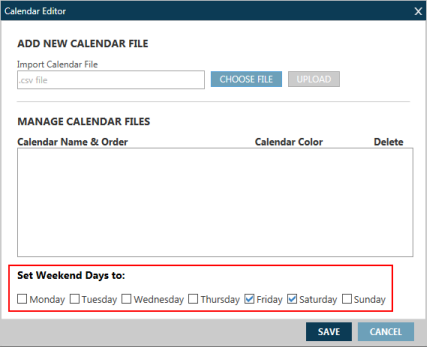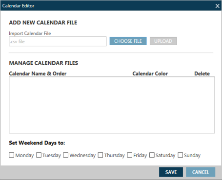 - Une fois que vous avez sélectionné le fichier de calendrier, cliquez sur TÉLÉCHARGER dans la boîte de dialogue Éditeur de calendrier pour afficher le fichier de calendrier dans la liste Gérer les fichiers de calendrier.