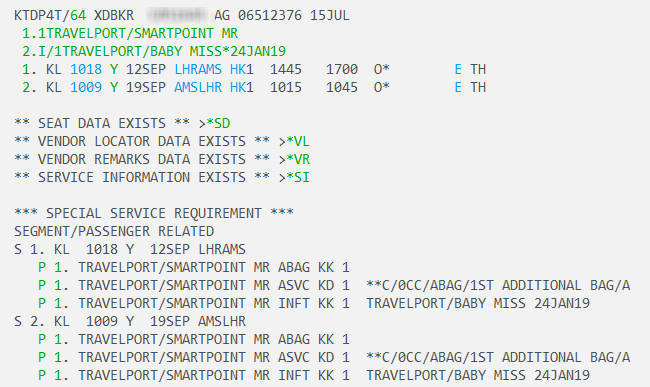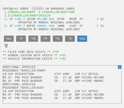 Voir Services auxiliaires (DAS) dans le guide du format Travelport+. Travelport+ (1G) et Apollo (1V) utilisent les mêmes formats pour les services auxiliaires.
