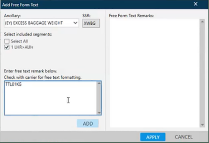 - Dans la zone de texte, entrez le texte libre obligatoire ou facultatif pour l’annexe. Notez que certaines compagnies aériennes exigent des formats de texte libre spécifiques pour certains relais statiques.