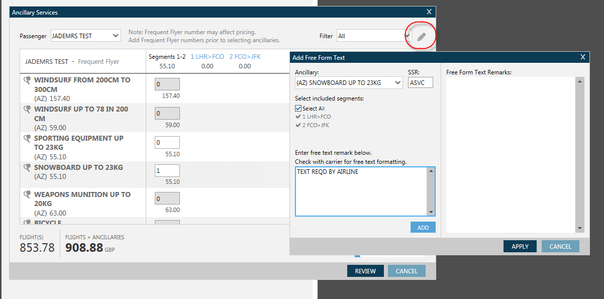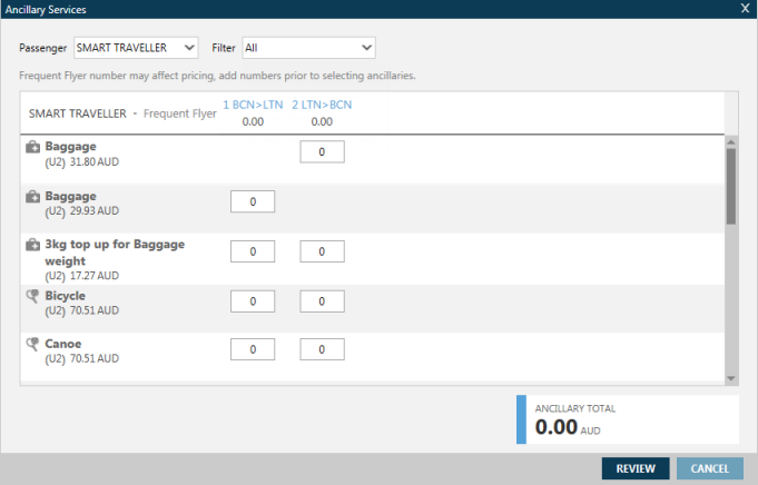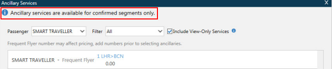 - Si la compagnie aérienne dessert par origine et destination, le même service doit être sélectionné pour tous les segments du voyage qui sont combinés par le tarif spécifique pour cet itinéraire. Par conséquent, vous ne pouvez effectuer une sélection de service auxiliaire que pour le premier segment applicable d’un ensemble combiné de segments.