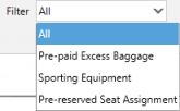 Optionnel. Cliquez sur la flèche Filtre dans le coin supérieur droit pour limiter les services auxiliaires affichés à un code de groupe sélectionné (type). Les codes de groupe disponibles varient en fonction des services disponibles pour l’itinéraire et des catégories désignées par la compagnie aérienne.