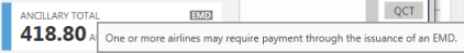 Dans cet exemple, une icône EMD à côté du total accessoire, qui indique qu’au moins un EMD est requis par une compagnie aérienne dans l’itinéraire pour effectuer le paiement d’un ou plusieurs frais annexes.