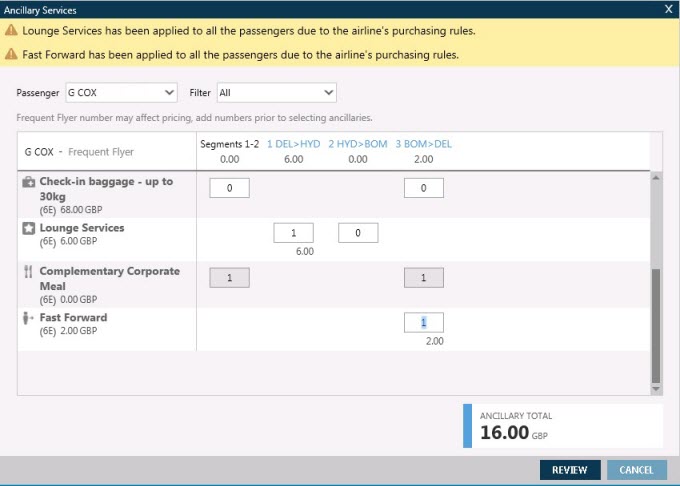 - Si la compagnie aérienne fournit des services par segments individuels dans le voyage, vous pouvez sélectionner des services individuels pour chaque segment du voyage.