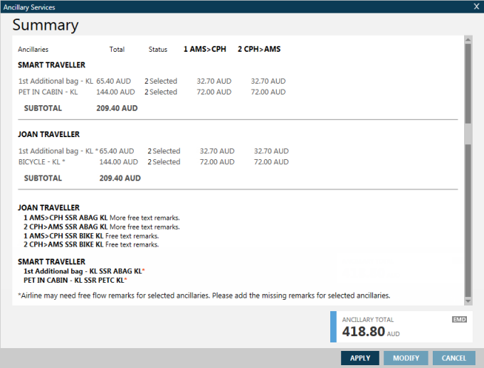 Une fois que les services auxiliaires et le texte libre applicable ont été saisis pour tous les passagers et les vols, cliquez sur Vérifier pour afficher le résumé des services auxiliaires.