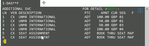Par exemple, si vous entrez DAS**F, l’écran du terminal n’affiche que les services auxiliaires liés au vol.
