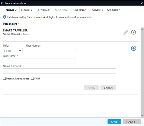 Certains écrans, tels que l’onglet Sécurité et le Gestionnaire d’APIS , incluent des champs de deuxième prénom, car ils peuvent être requis pour le nom légal du passager. Les deuxièmes prénoms peuvent également être confirmés ou ajoutés sur ces écrans.
