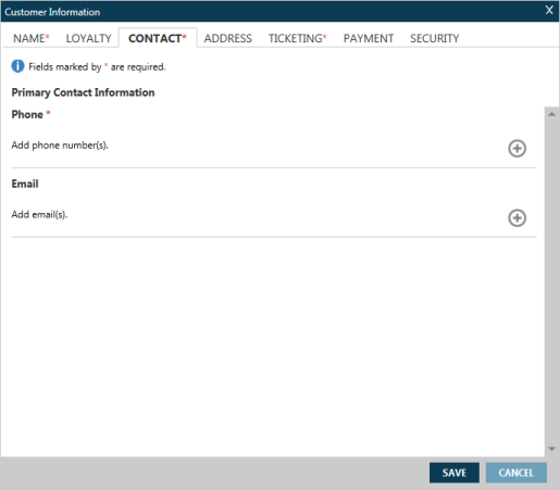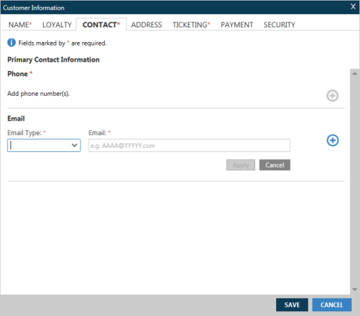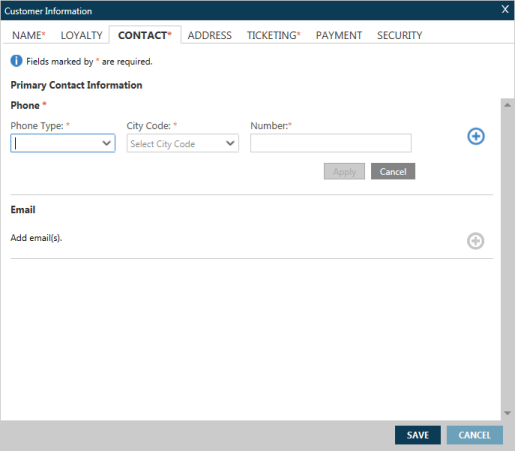 Vous pouvez ajouter des informations de contact obligatoires et facultatives pour votre fichier PNR/Réservation dans l’onglet Contact de l’écran Informations sur le client .