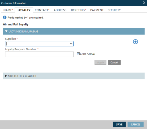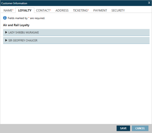 - Dans l’écran Renseignements sur le client , cliquez sur l’onglet Fidélisation pour afficher l’écran Fidélisation aérienne et ferroviaire.