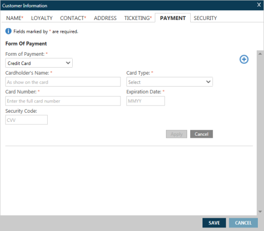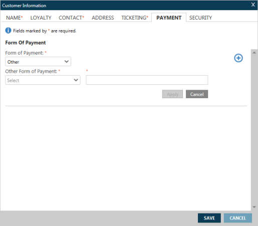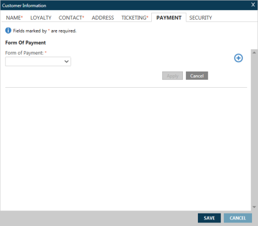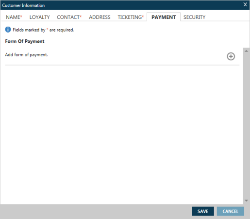 Vous pouvez ajouter des informations de paiement pour votre PNR/Fichier de réservation dans l’onglet Paiement de l’écran Informations sur le client .