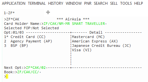 ZF* ou ZF*Cxx (où xx est le code de la compagnie aérienne à deux lettres) pour afficher une liste des modes de paiement acceptés par un transporteur spécifique.