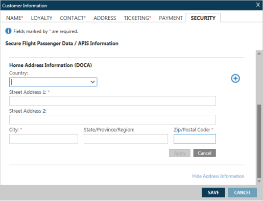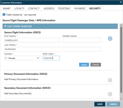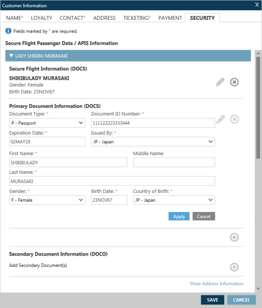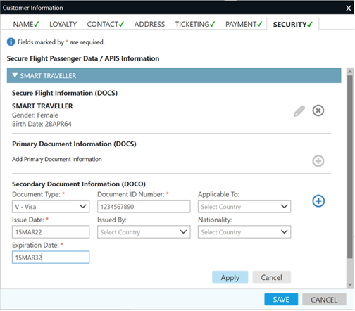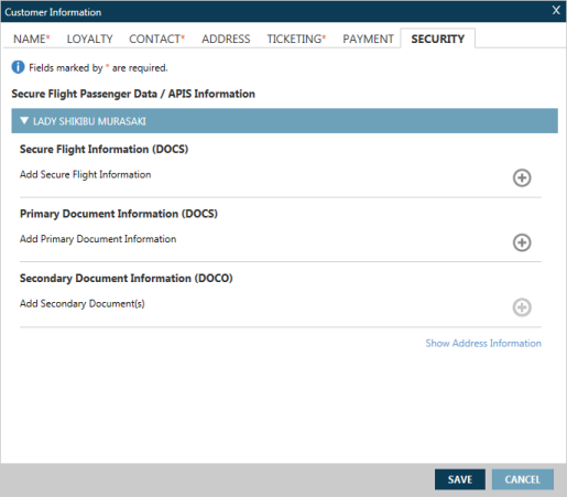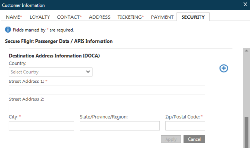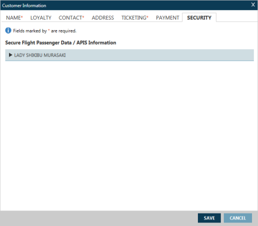 Dans l’écran Informations sur le client , cliquez sur l’onglet Sécurité pour afficher l’écran Données sur les passagers des vols sécurisés/Informations APIS.