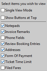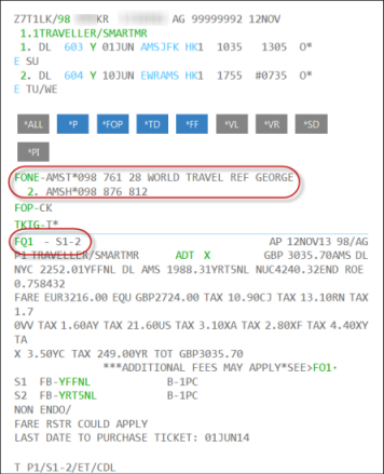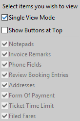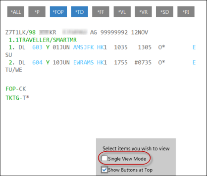 À l’exception des noms des passagers et de l’itinéraire, vous pouvez afficher les champs PNR/Fichier de réservation à l’aide des boutons d’accès rapide PNR. Vous pouvez cliquer sur un ou plusieurs boutons d’accès rapide pour afficher uniquement les informations PNR/Fichier de réservation souhaitées.