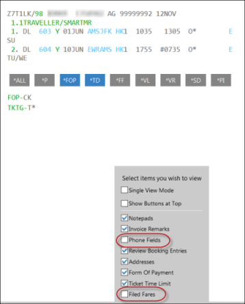 Par exemple, si vous désactivez les champs Téléphone et Tarifs enregistrés (ATFQ), ces champs sont supprimés de l’affichage par défaut du PNR/Fichier de réservation.