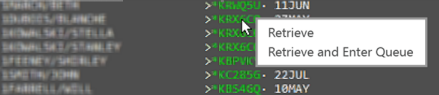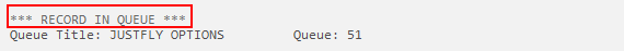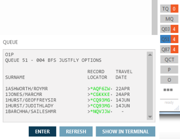 - Cliquez sur Récupérer et entrer dans la file d’attente pour ouvrir le fichier PNR/Réservation en file d’attente. Lorsque le PNR/Fichier de réservation est affiché, le message ENREGISTREMENT EN FILE D’ATTENTE indique que le PNR/Fichier de réservation est ouvert en file d’attente.