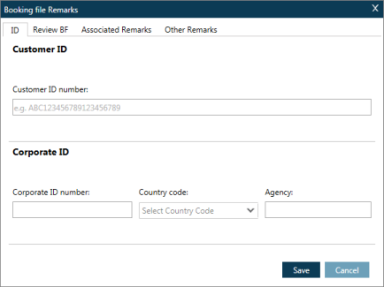 L’onglet ID de l’écran Remarques du fichier PNR/Réservation s’affiche.