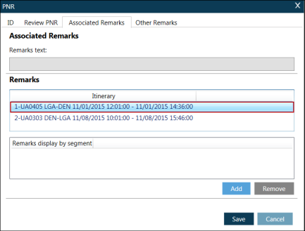 Sélectionnez l’onglet Remarques associées , qui affiche automatiquement les segments réservés de l’itinéraire. L’onglet Remarques associées est le même pour les PNR Apollo (1V) et les fichiers de réservation Travelport+ (1G).