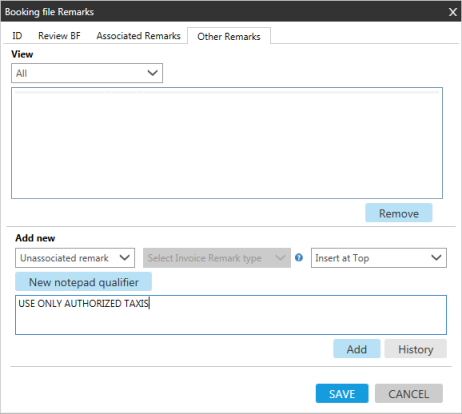 Vous pouvez ajouter des notes et des remarques historiques dans un fichier PNR/Réservation ou supprimer entièrement la remarque.