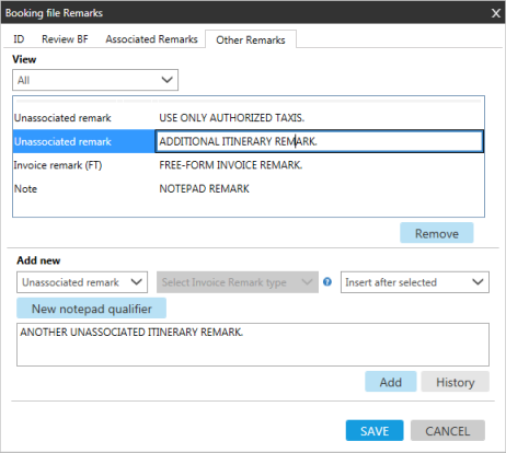 - Cliquez sur Ajouter pour ajouter la remarque à la liste. Le texte de forme libre ajouté à une remarque utilise les mêmes exigences pour Travelport+ et Apollo :