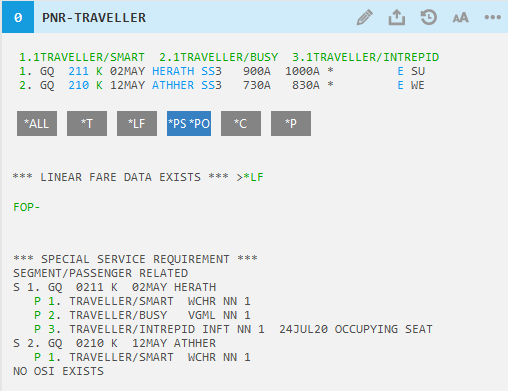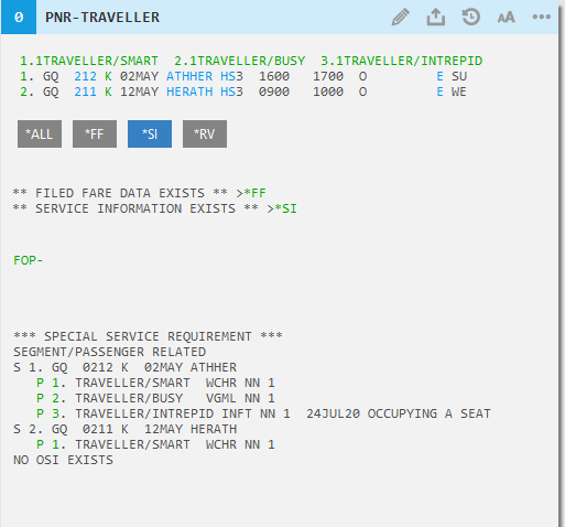 Optionnel. Dans le visualiseur PNR, cliquez sur *SI dans Travelport+ (1G) ou *PS*PO dans Apollo (1V) pour afficher les SSR ajoutés dans le fichier PNR/Booking.