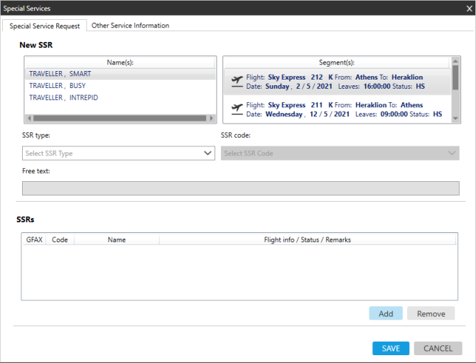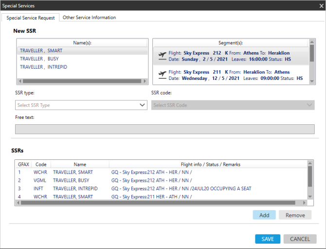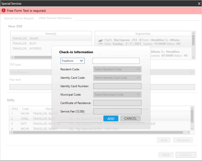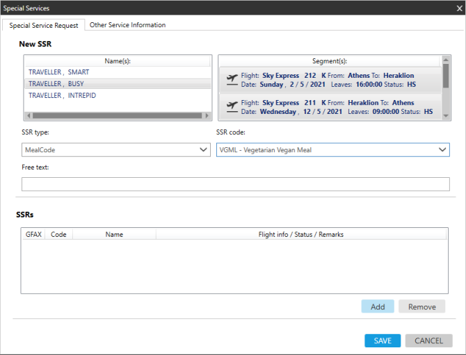 Cliquez sur Ajouter pour ajouter les SSR au fichier PNR/Réservation.