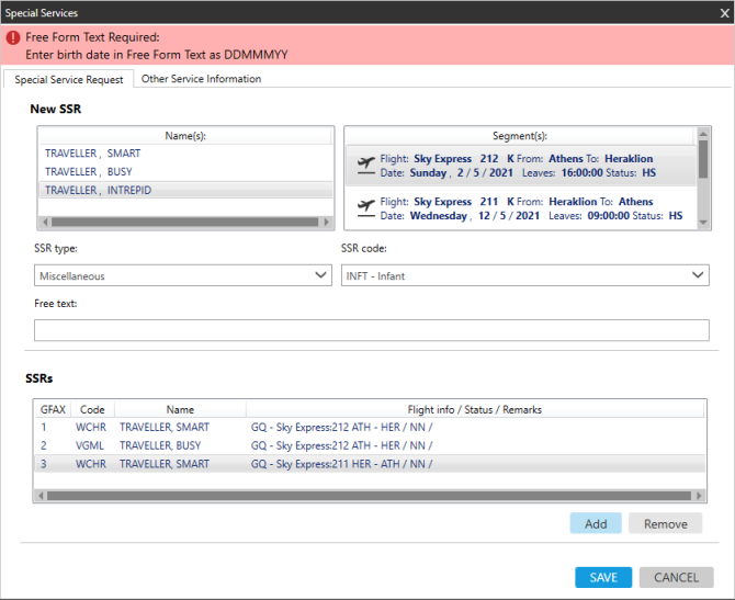 Dans cet exemple, le SSR Miscellaneous/INFT exige que la date de naissance de l’enfant soit ajoutée dans le champ Texte libre .