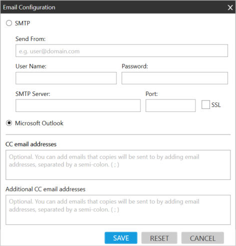 - Si Outlook est disponible, vous pouvez sélectionner Microsoft Outlook pour utiliser automatiquement les paramètres Outlook actuels de votre système. Les e-mails s’afficheront dans votre boîte Envoyés Outlook existante.