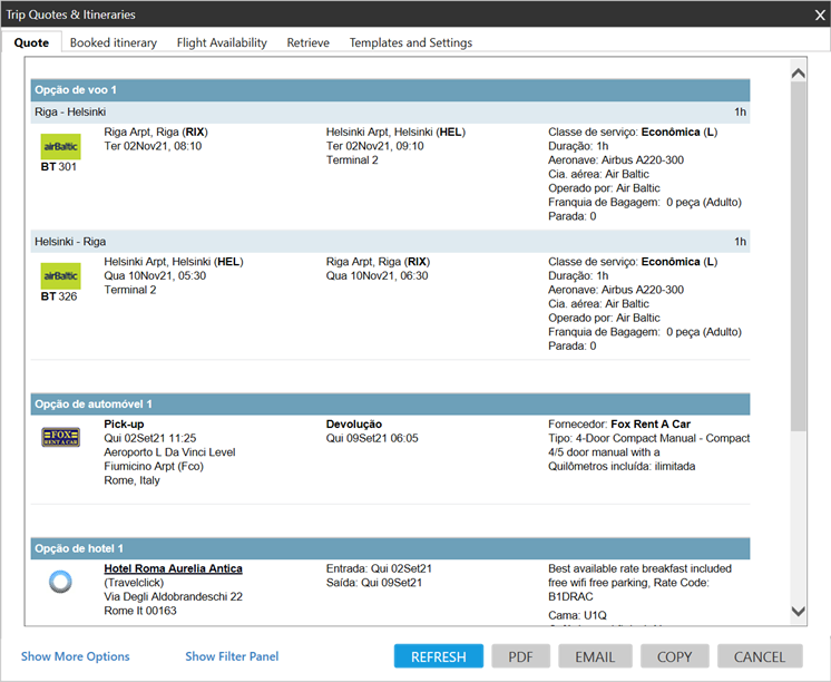 Toutes les citations ou itinéraires, tels que les logos et les coordonnées de l’agence, les remarques, les en-têtes et les préférences en matière d’e-mail. Ces préférences sont gérées dans l’onglet Modèles et paramètres .
