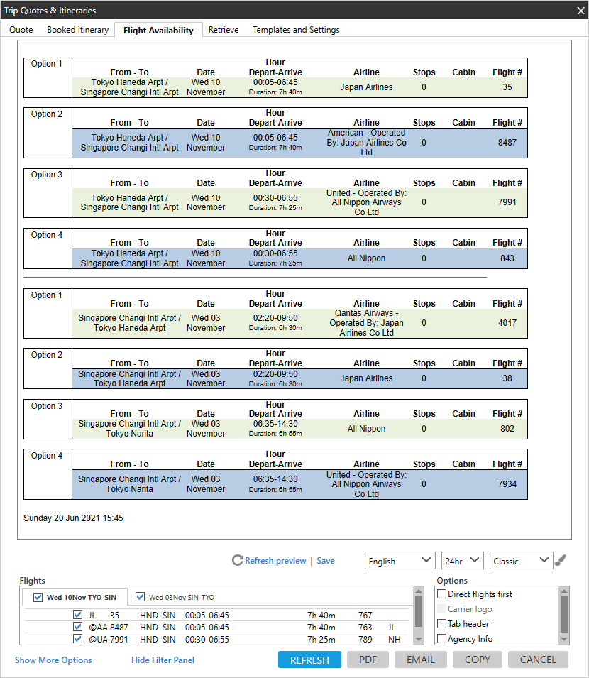 Pourboire! À tout moment, vous pouvez actualiser ou enregistrer les modifications apportées aux horaires de vol.