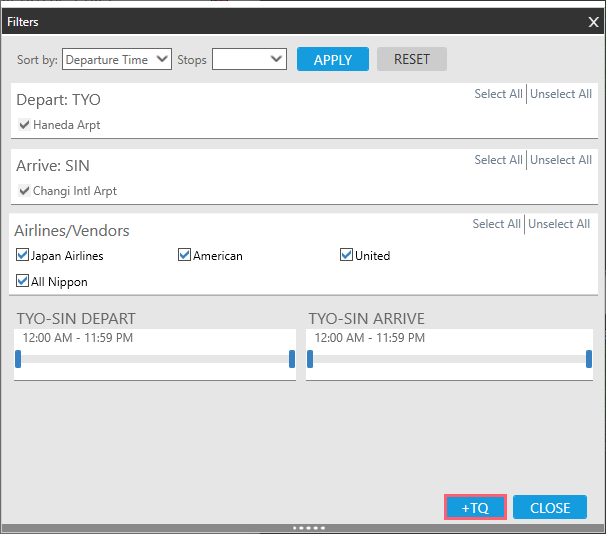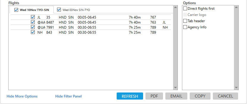 - Apportez les modifications souhaitées aux résultats. Voir Filtrage des résultats de disponibilité de l’air pour plus de détails.