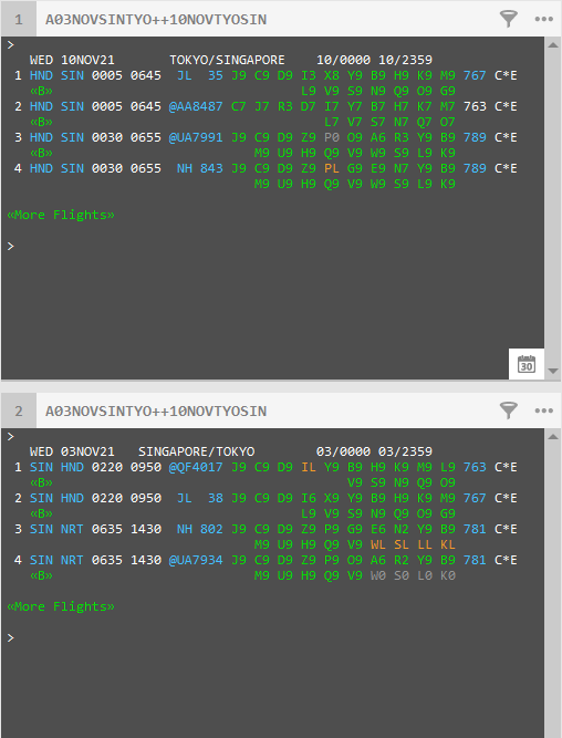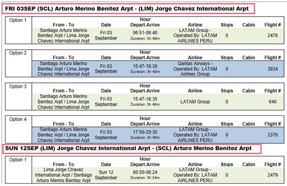 - Effectuez une recherche dans la disponibilité des avions . Par souci de brièveté, cette réponse est limitée à quatre résultats pour chaque segment. Cependant, Trip Quote inclut tous les segments renvoyés dans chaque fenêtre.