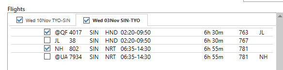 - Dans la fenêtre Devis et itinéraires de voyage, cliquez sur l’onglet Disponibilité des vols pour afficher les segments aériens disponibles.