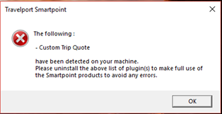 Si vous ne désinstallez pas Custom Trip Quote, vous pouvez continuer à utiliser le plugin. Cependant, le message d’avertissement suivant s’affiche chaque fois que vous lancez Smartpoint 10.0.