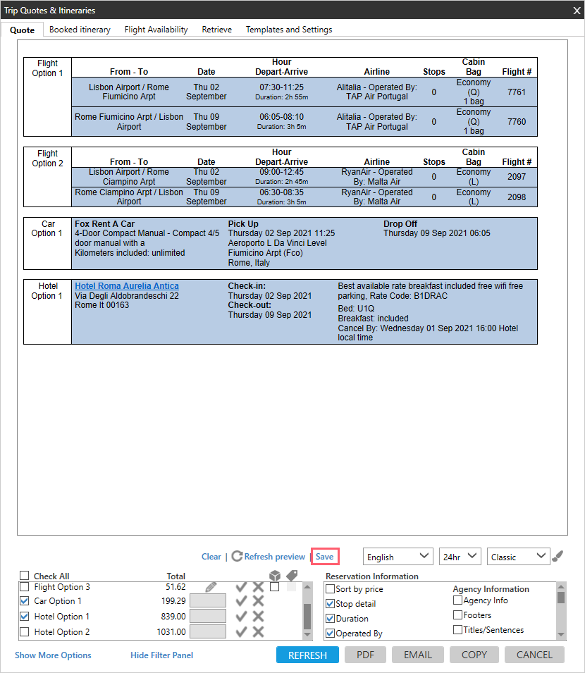 - À partir des onglets Devis, Itinéraire réservé ou Disponibilité du vol , cliquez sur Enregistrer pour le devis ou l’itinéraire souhaité.