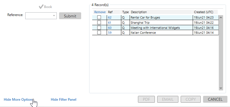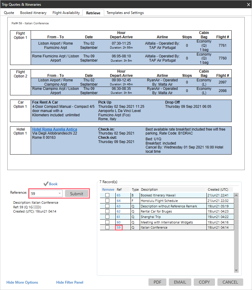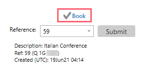 - Pour accéder à l’enregistrement enregistré d’un autre agent, entrez ou faites défiler jusqu’au numéro de référence dans la liste Référence , puis cliquez sur Envoyer. Les agents doivent utiliser le même PCC pour accéder aux enregistrements stockés pour ce PCC.