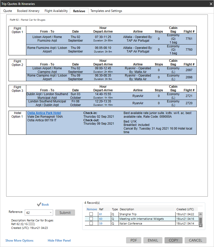 Dans Trip Quote, vous pouvez enregistrer et récupérer jusqu’à 20 options de devis, itinéraires réservés et horaires de vol.