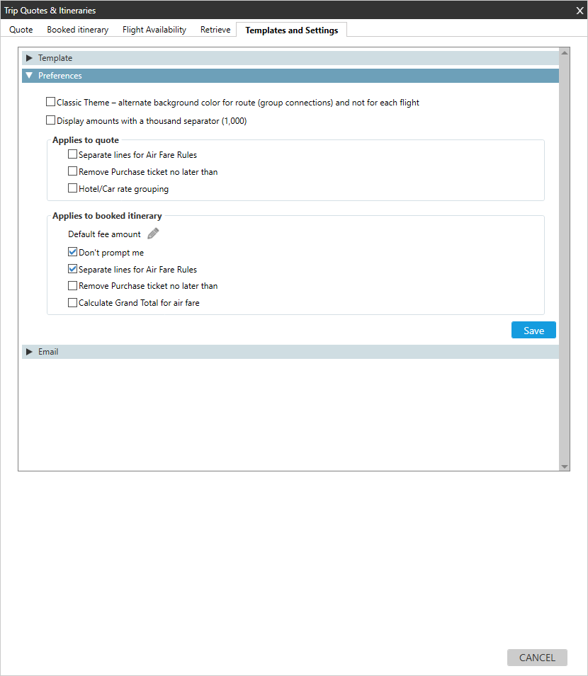 Vous pouvez utiliser les préférences de Trip Quote pour personnaliser diverses options d’affichage et de fonctionnalités. Ces personnalisations sont affichées dans les onglets Devis, Itinéraire réservé et Disponibilité des vols .