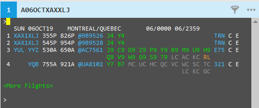 Pourboire! Cette rubrique décrit la recherche de disponibilité à l’aide de l’écran de recherche de disponibilité aérienne. Voir Recherche de vols disponibles : Formats de terminal pour les formats de terminal équivalents Travelport+ (1G) et Apollo (1V).